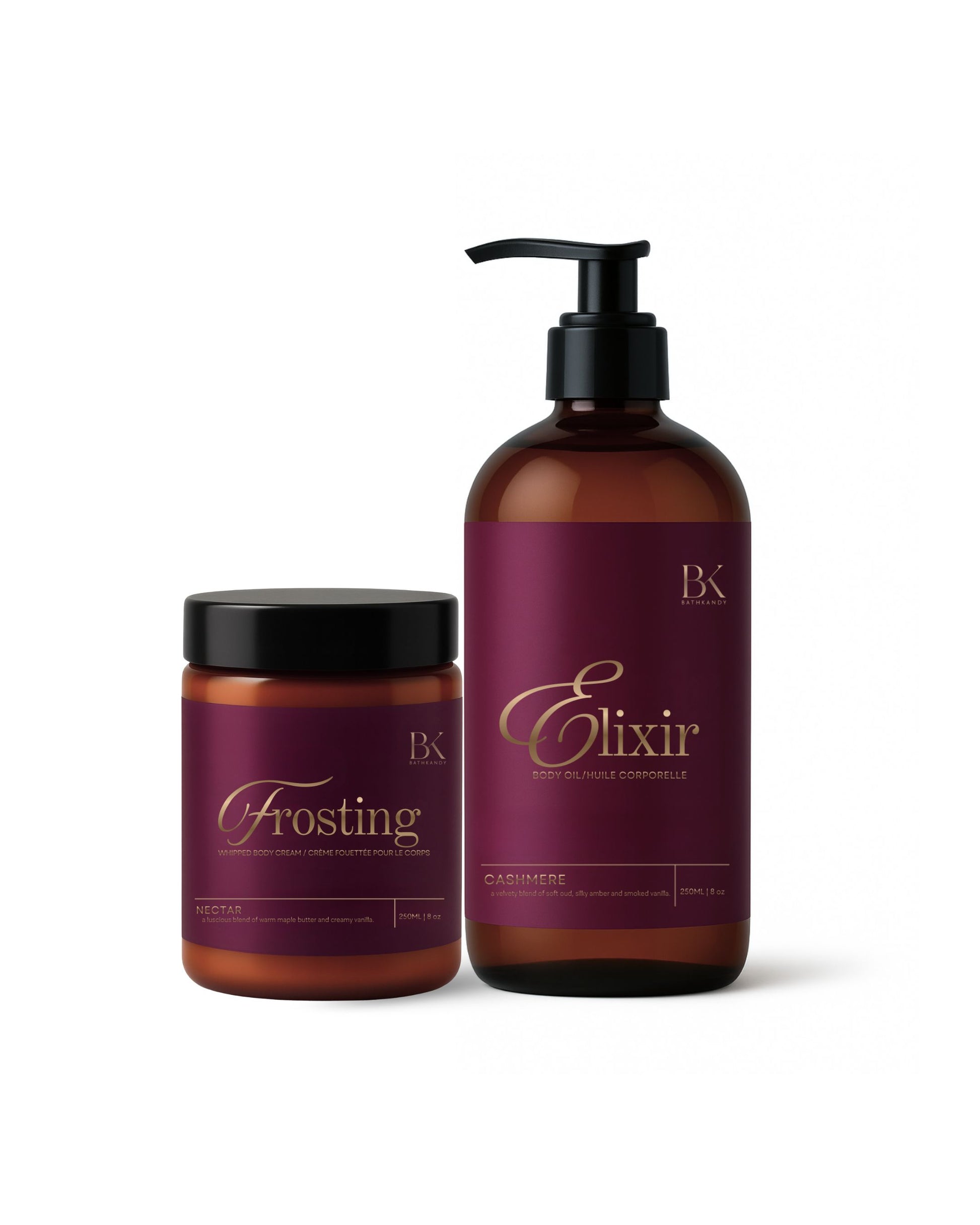 The Lush Duo pairs Frosting, our cushioned mid-weight whipped body cream, with Elixir, our silky, glow-enhancing body oil. Together, they deliver comforting hydration, softness, and a warm, scent-rich finish that leaves the skin velvety, conditioned, and beautifully luminous.