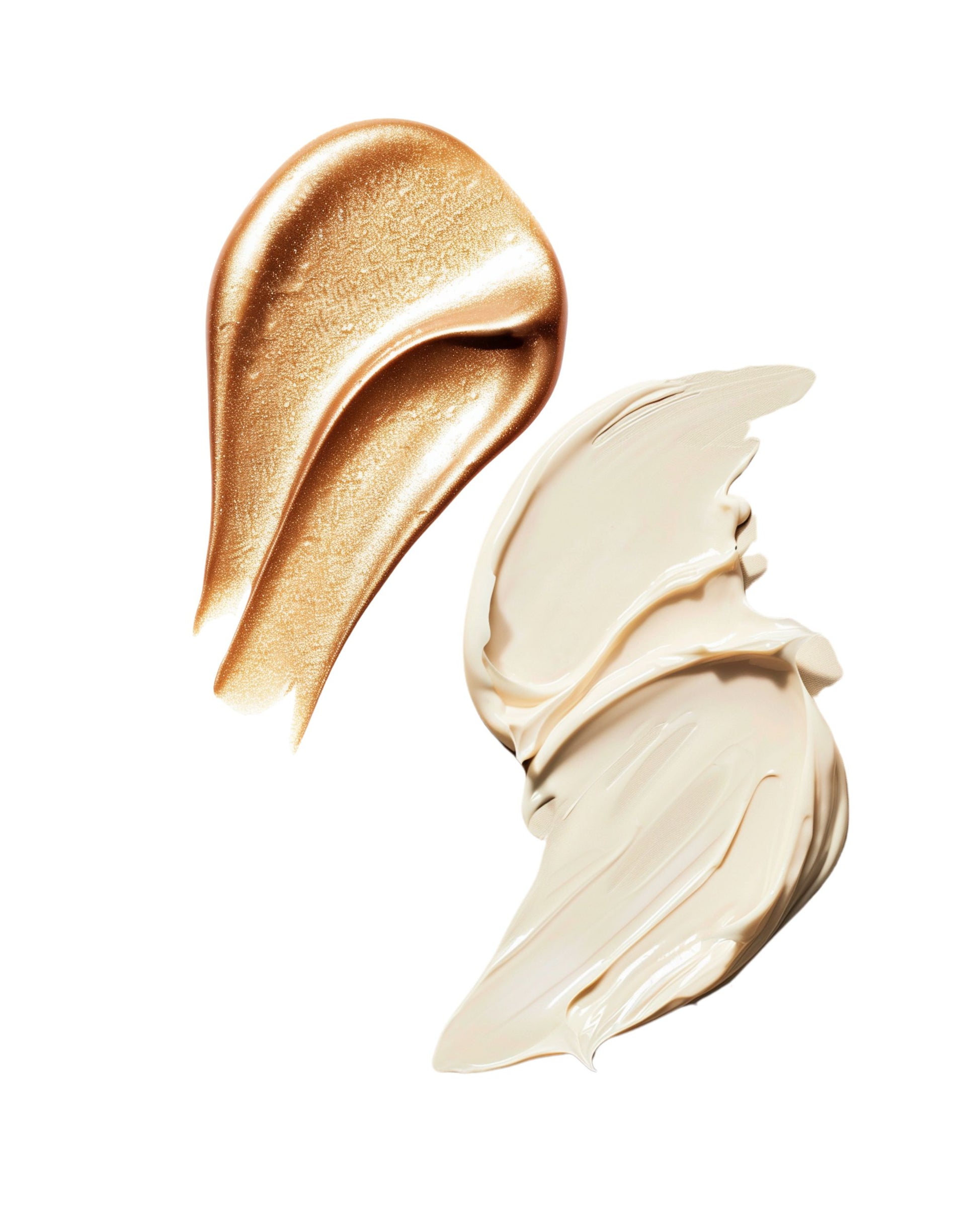 Frosting: plush, creamy, velvety. Elixir: silky bronze/gold gel-oil with a radiant finish. Together: a rich-meets-luminous layering ritual that leaves skin deeply conditioned and glowing.